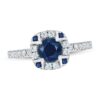 This incomparable women’s ring showcases a striking round natural blue sapphire encircled by dazzling diamonds and embellished with even more dazzling round natural sapphires while brilliant round diamonds fill the band. A final natural blue sapphire gemstone adorns the back to complete the look. Fashioned in 10K white gold, the total diamond weight of the ring is 1/4 carat.