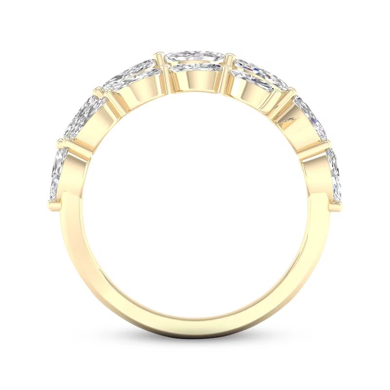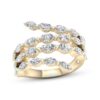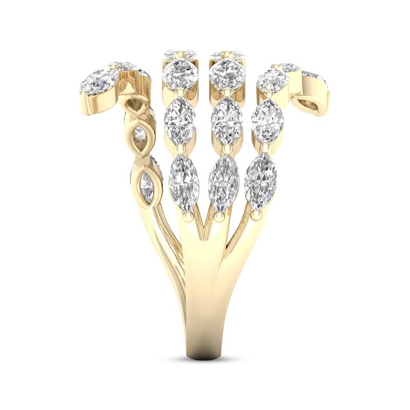 Stunningly chic, this ring emits show-stopping sparkle. Magnificent marquise-cut diamonds are artfully arranged in the sweeping open silhouette. Styled in classic 14K yellow gold, the ring has an exceptional total diamond weight of 2 carats.
