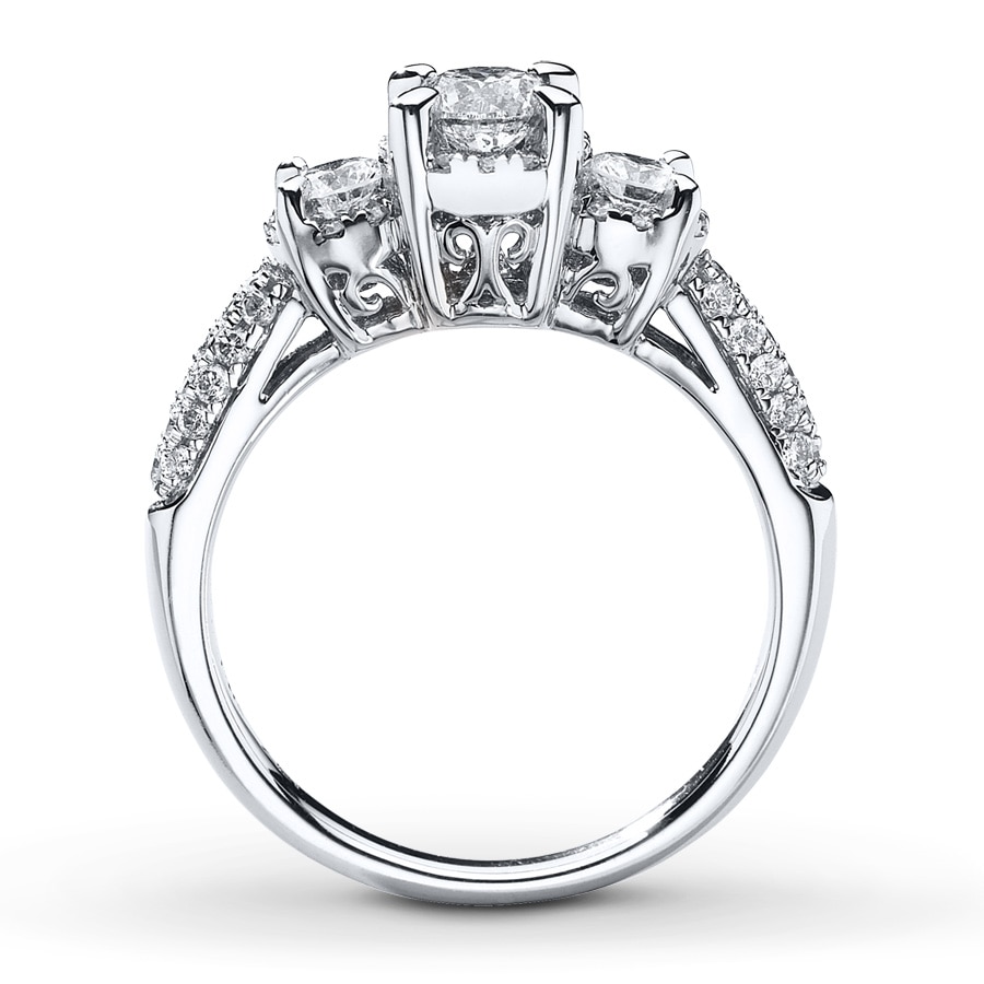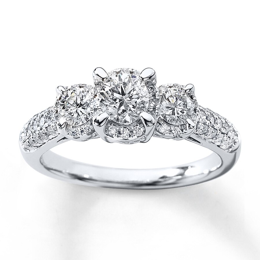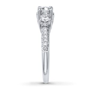 Representing your glowing past, present and future, this exquisite three-stone diamond ring will quickly become a cherished part of any jewelry collection. Additional round diamonds cascade down each side of the band. The ring, styled in 14K white gold, has a total diamond weight of 1 carat. Available online while supplies last.Treasures are not eligible for in-store pickup.Treasures may only be shipped either to your home address or to an alternate address.